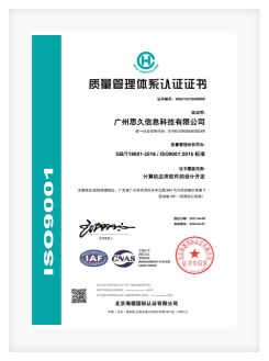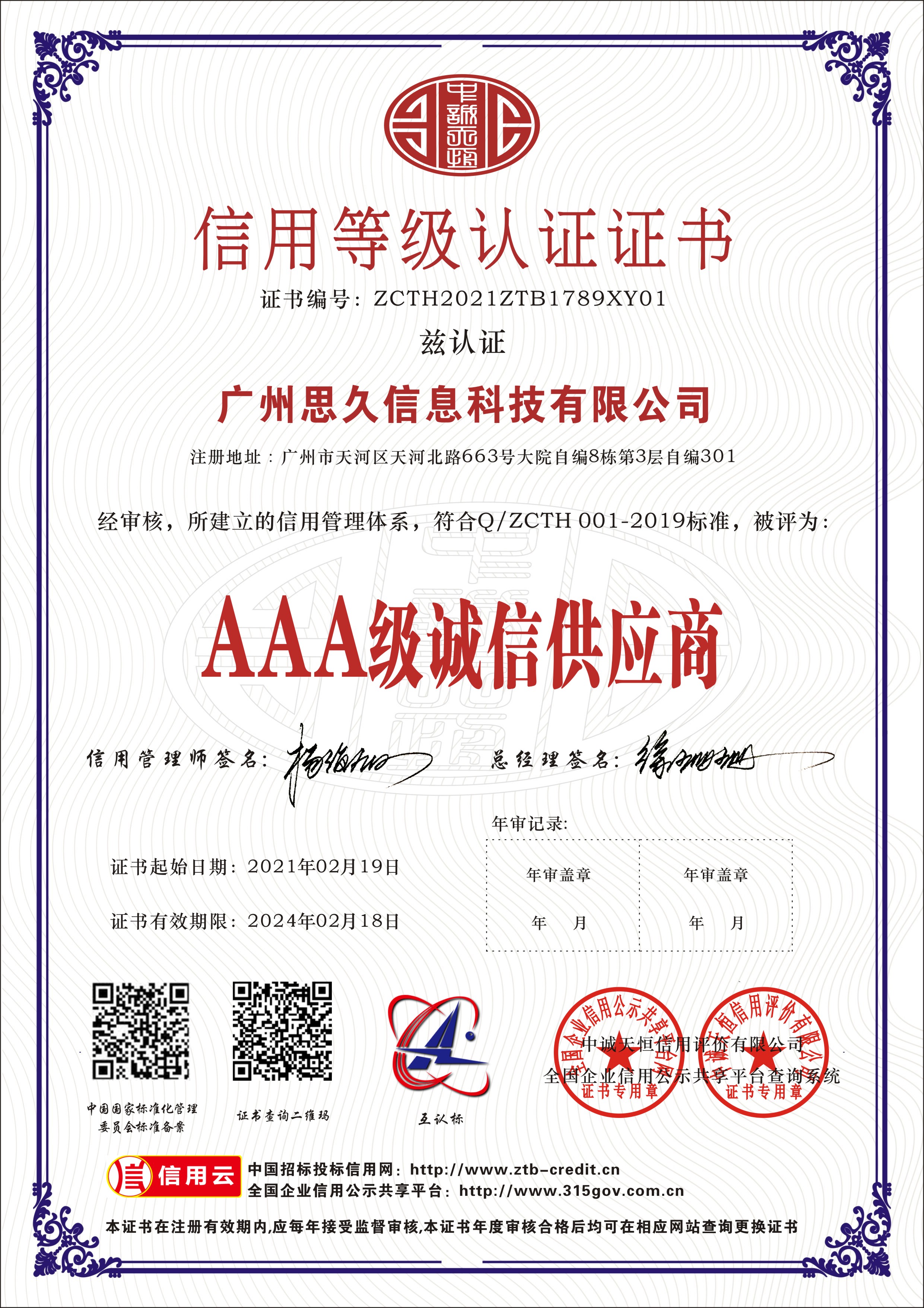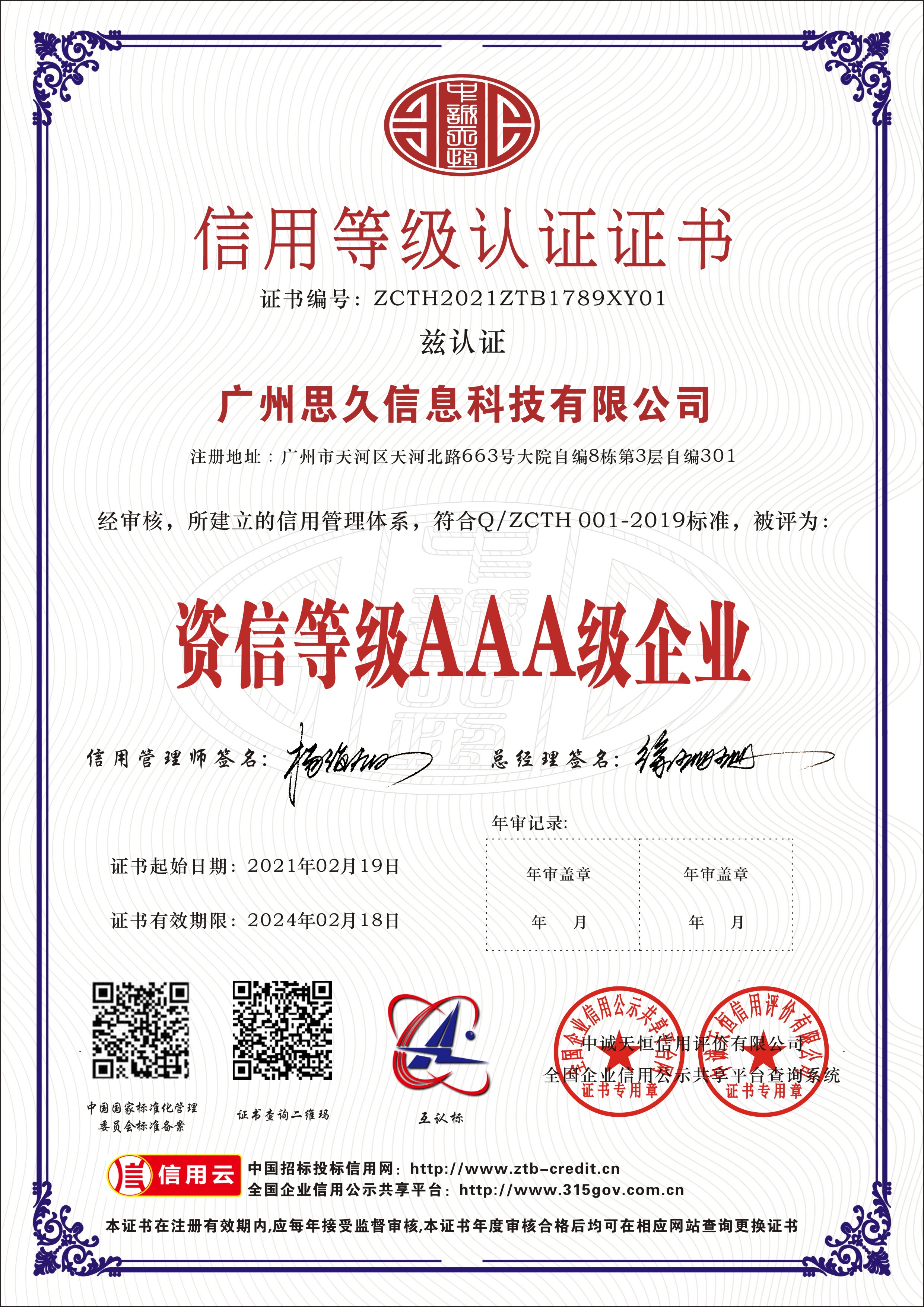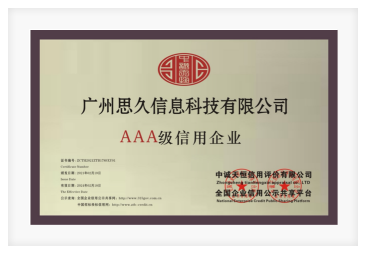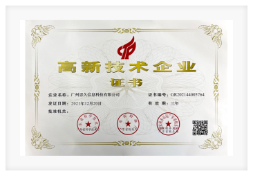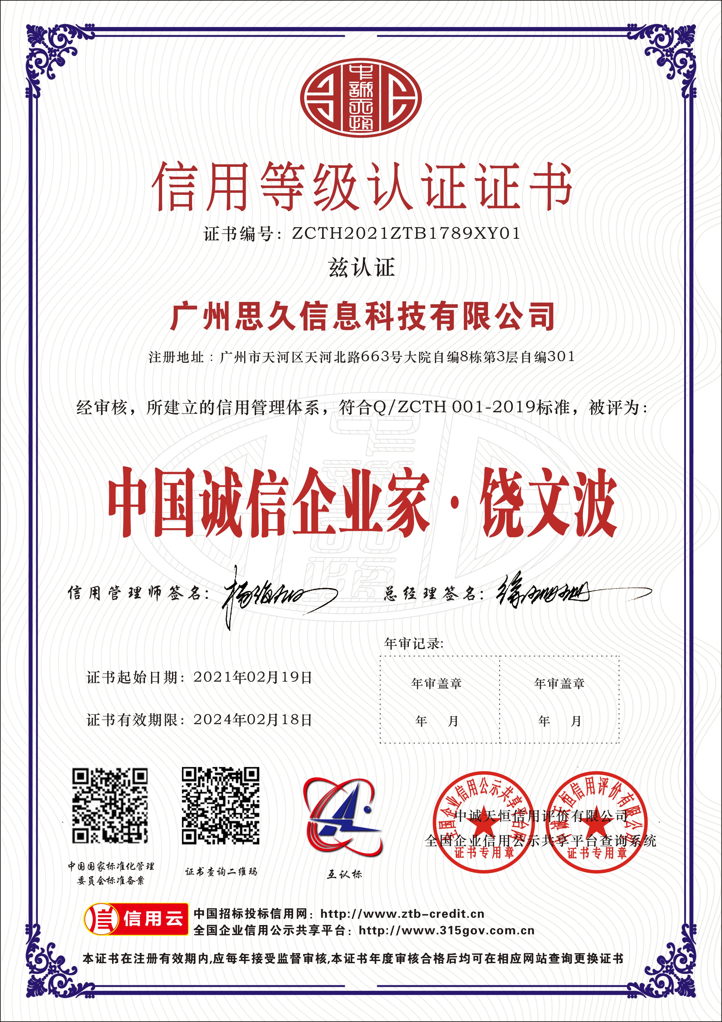 突破创新:承接广东省智慧消防大数据管控平台,广东省医疗协会500+医院停管系统监控,广东省建筑集团工会福利系统定制同年思久科技通过国家高新技术企业认证;通过ISO9001:国际质量管理体系标准和ISO27001信息安全管理体系认证,并荣获“3A级信用企业”荣誉称号,同一时间,公司法人饶文波被评为“中国诚信企业家”